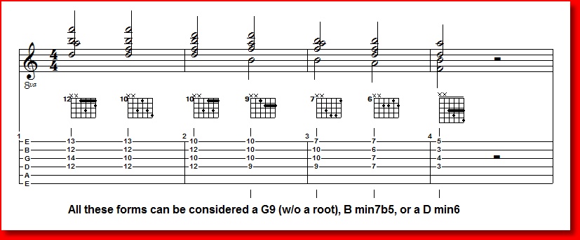 Minor 6 Forms: Throughout Mickey's course, these forms are only referred to as min6, when in fact, they are also minor7b5 (sometimes referred to, especially by nonguitarists, as half diminished), and a dominant 9 without a root. A simple way to remember them was taught to me by Art Borgeson: Think of a Major triad, e.g., G, comprising the notes G - B - D. The form can be a G9 (once again without a root), B min7b5 (or a B 1/2dim7), or a D min6. Here are those forms: